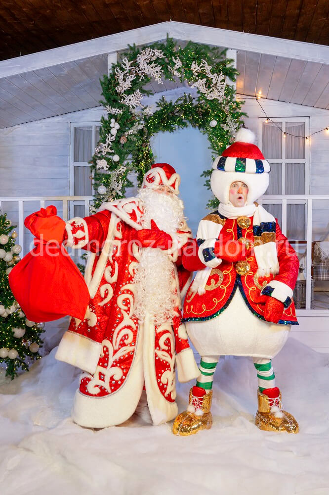 Самый настоящий Санта Клаус принёс в дом дух Рождества! Его красные штаны и традиционная шуба, подпоясанная широким чёрным ремнём, окантованы широким белым мехом с золотой фигурной отстрочкой. Не обойдётся Санта Клаус и без красных сапог, белых перчаток, бороды и колпачка. А если вдруг наш актёр окажется недостаточно упитанным, то для таких случаев предусмотрен накладной живот, который имеет надёжное крепление к телу и выглядит очень натурально.
