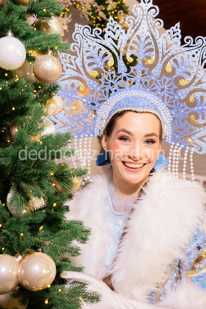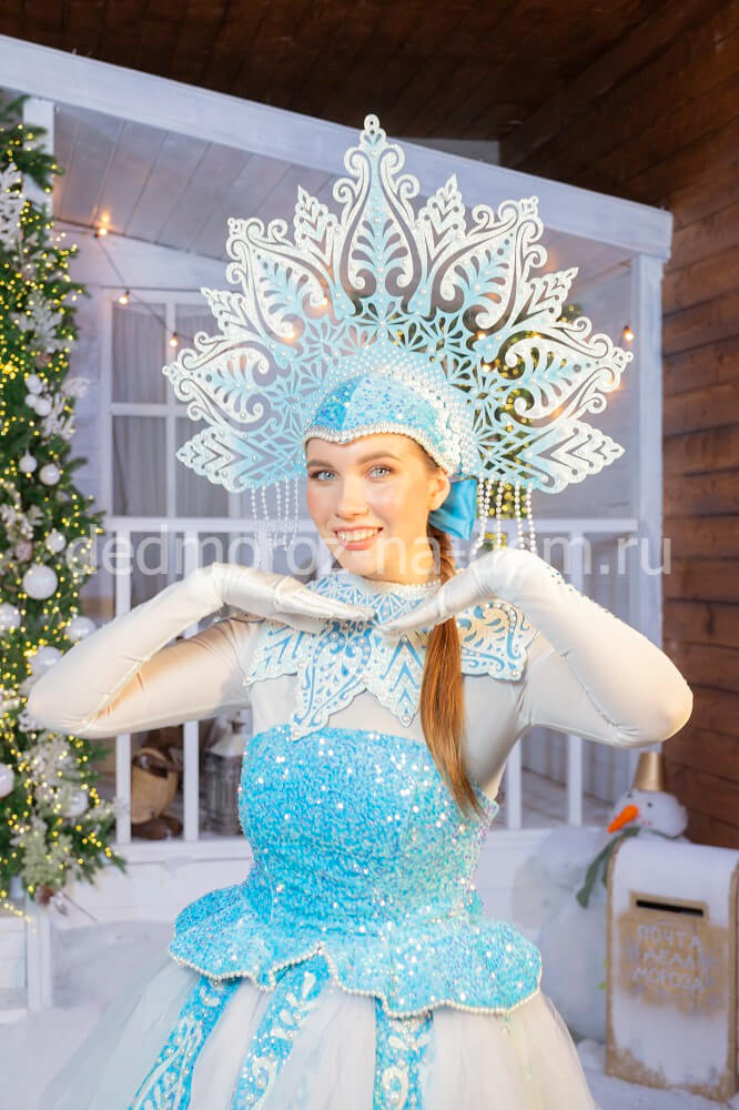 Шубка Снегурочки навевает воспоминания о традиционных русских сказках. Этому способствуют в первую очередь широкие рукава, окантованные мехом. Застёгивается шубка на красивую сверкающую брошь. Сама шубка сделана из голубой ткани с серебристым рисунком, и отстрочена по всем краям белым мехом. Голову Снегурочки украшает голубая шапочка с мехом и кружевом. Под шубой находится белая длинная рубаха с кружевом, а на руки надеваются голубые рукавички.