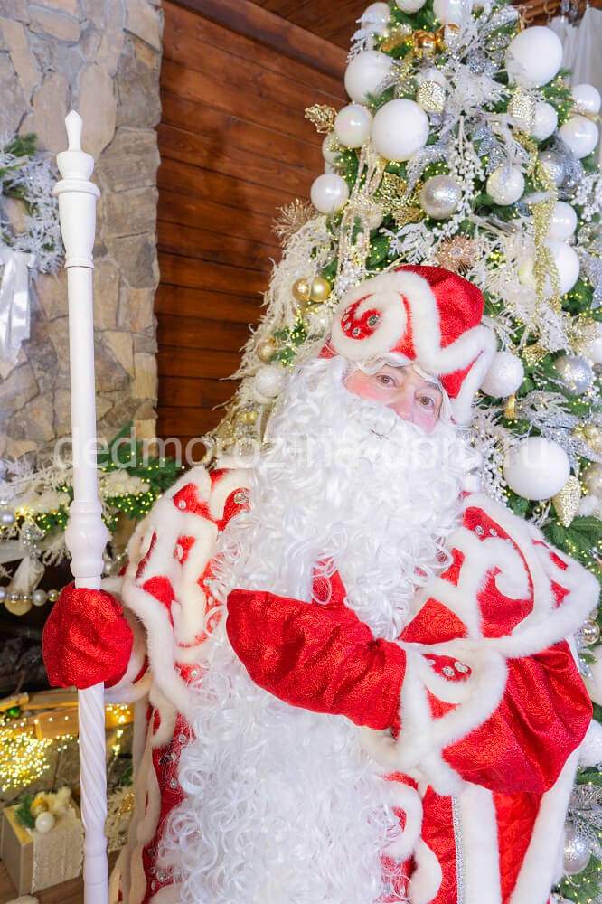 Этот костюм Деда Мороза сделан из красного бархата с красными узорами, что делает цвет интенсивнее, а саму шубу более красивой и интересной. Шуба также разрисована причудливыми серебристыми узорами и украшена большими растительными орнаментами со стразами того же цвета. Край шубу отделан коротким белым мехом. Из этого же меха сделаны манжеты, воротник и край шапки. Под шубой у Деда Мороза находится длинная белая рубаха с серебристыми манжетами, которая подпоясывается широким красным поясом. Внизу рубаха украшена широкой серебристой тесьмой.