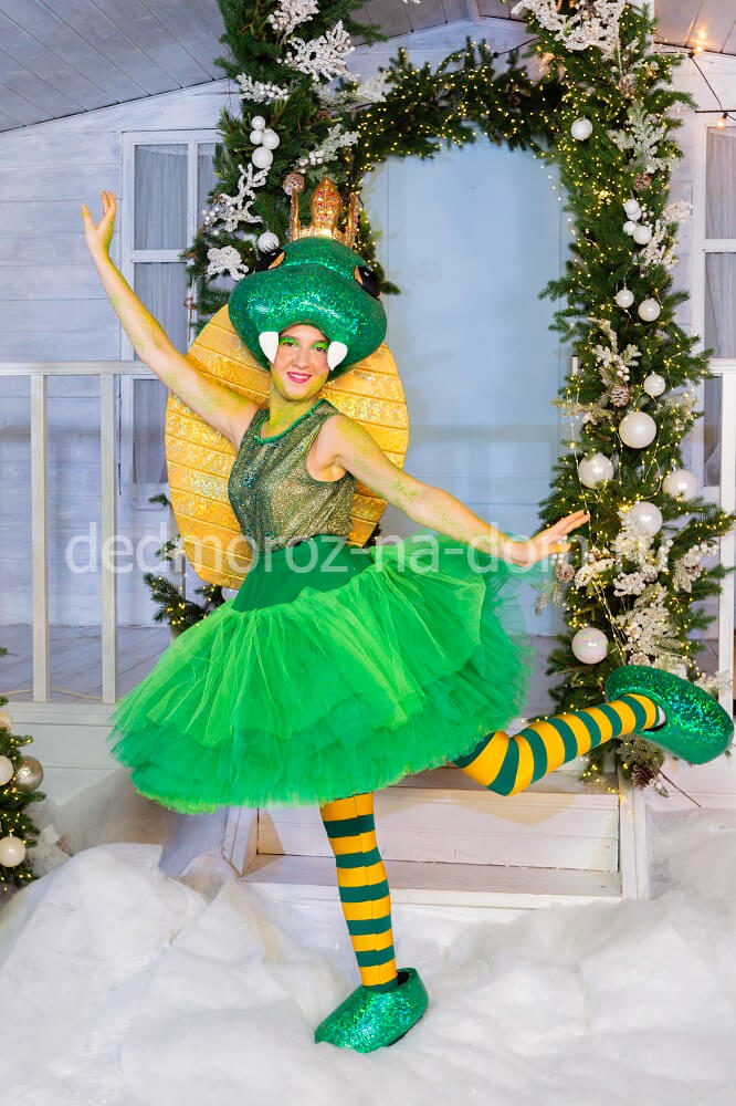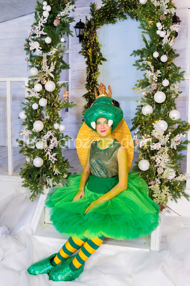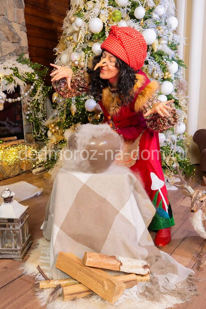Подруга Санта Клауса облачена в красное слегка приталенное платье с меховым низом. Дополняет картину золотой поясок с белыми помпонами, жилетка из белого меха и праздничный колпачок. |