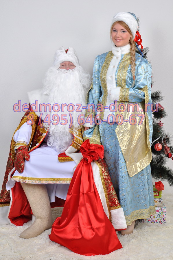 «Царская сине-золотая» Снегурочка отлично гармонирует с Дедом Морозом в «Царском синем» костюме. Этот же костюм есть и в красном варианте. Костюм сделан из синей ткани и украшен узорами серебряного цвета. |
