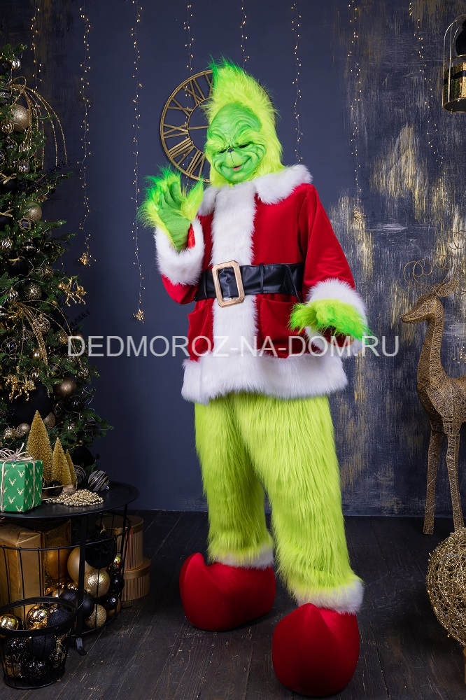 Костюм Гринча идеально подходит для Нового года, Рождества, хэллоуина, косплей вечеринки. Костюм состоит из полушубка, мохнатых штанов и таких же перчаток зеленого цвета, латексной маски, пояса и большущих красных ботинок в тон куртки. Если бы не его озорство с украденным Новым годом, вполне милый сказочный человечек оригинальной наружности.