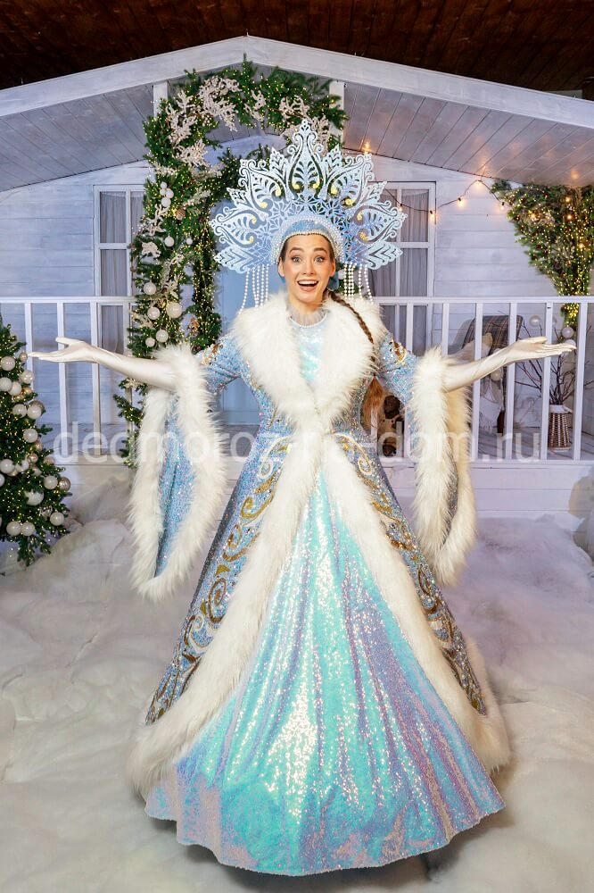 Шубка Снегурочки навевает воспоминания о традиционных русских сказках. Этому способствуют в первую очередь широкие рукава, окантованные мехом. Застёгивается шубка на красивую сверкающую брошь. Сама шубка сделана из голубой ткани с серебристым рисунком, и отстрочена по всем краям белым мехом. Голову Снегурочки украшает голубая шапочка с мехом и кружевом. Под шубой находится белая длинная рубаха с кружевом, а на руки надеваются голубые рукавички.